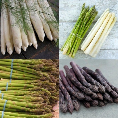 - 10 Paarse Asperges, voor de donkerpaarse teelt of wit met een paarse gloed. Deze extra smakelijke soort wordt donkerpaars als je ze in het licht laat groeien en wit met een paarse gloed als ze onder de grond groeien.
