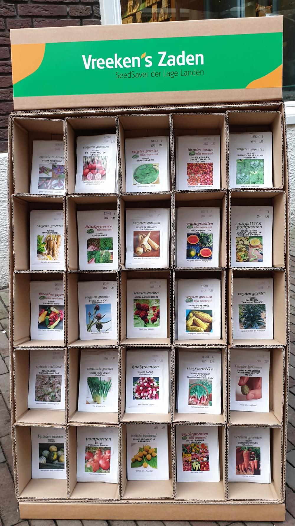 Onze voorwaarden voor wederverkoop vind je hier De foto toont een ingerichte display waarvan de aanschaf € 350,00 is en de verkoopwaarde € 550,00. Dat betekent een verdienste van € 200,00 en je zult vast en zeker zaden moeten bijkopen na enige tijd, want we zijn erg zeker van de gangbaarheid en aantrekkingskracht van onze zaden! Krijg je interesse? Als we zo’n complete