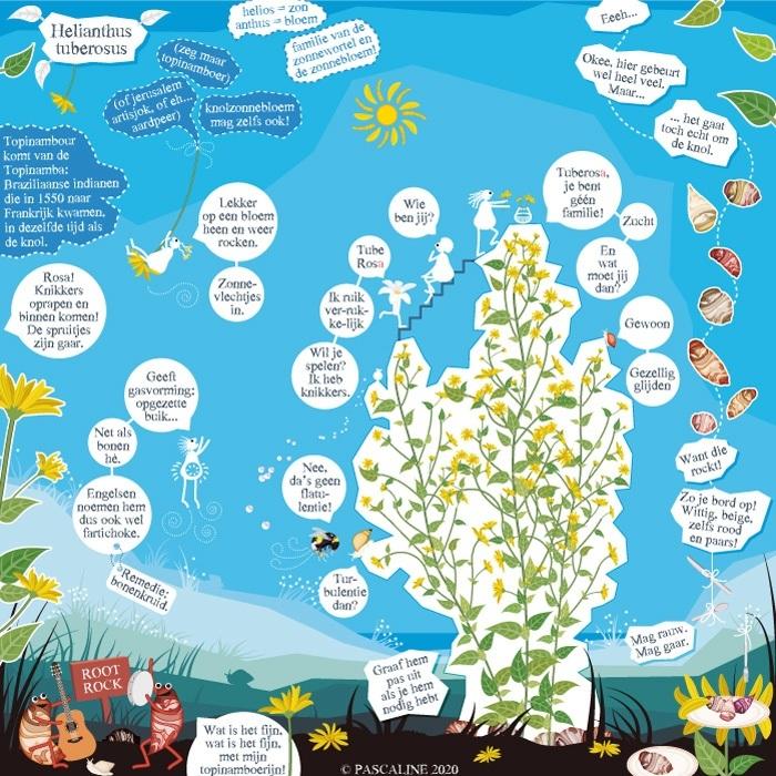 Jullie kijken vast alweer uit naar een volgende tekening van Pascaline! Dit keer heel toepasselijk gaat de verhalende tekening over de Aardpeer of (op zijn Frans) Topinambour. Vergroot de foto (door er op te klikken) en geniet van de leerzame en grappige details!
