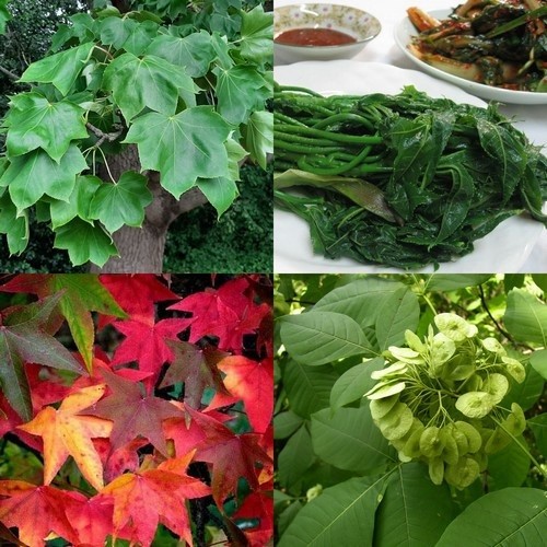 Kalopanax septemlobus STEKELBOOM Tamelijk zeldzame boom afkomstig uit Azië. Het boompje kan voortdurend gesnoeid worden en vormt een fraaie kroon van esdoornvormig blad, de herfstkleur is goudgeel. Ze zijn heel decoratief en bloeien net als de Hedera met trosjes, die in de herfst en winter tot donkerblauwe bessen afrijpen. De stam vormt stekels, vandaar de naam. De jonge scheuten zijn eetbaar en worden kort gekookt of geroerbakt. Teelt in een
