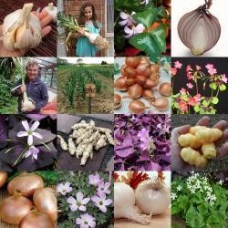 We stellen een (wisselend) pakket samen, waar in elk geval Olifantenknoflook in zit, verder stoppen we er in: plantuitjes, sjalotten, soorten limoenklaver, Altajse Uitjes, Crosne (Japanse Andoorn) en Oca (Klaverzuring).