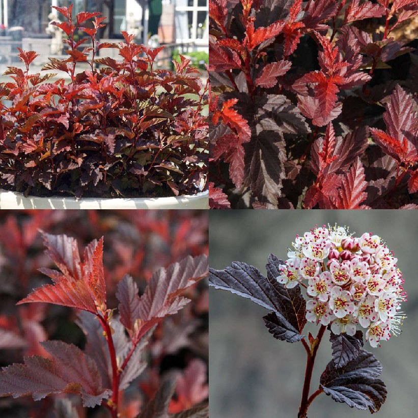 (Physocarpus opulifolius ‘Little Angel’) Deze compacte plant heeft prachtig warmrood blad. Door zijn goede vertakking heeft Little Angel een volle en gezonde uitstraling. In de zomer verschijnen wit-roze, bolvormige bloemschermen. De struik heeft een bossige opbouw met een prettig lage hoogte van 50 cm en een breedte van 30 cm.
