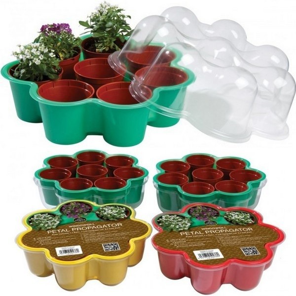 Dit gezellige bakje om in te zaaien of te stekken is extra aantrekkelijk voor kinderen door de vrolijke bloemvorm. De 7 rondingen bevatten potjes (8x6 cm), om (dus) in te zaaien of te stekken. Het geheel wordt afgedekt met een transparant kapje. Het minikasjegeheel is 21 cm doorsnee en 13 cm hoog. We leveren in de kleuren groen, geel of rood (onze keus). Je bestelt ze hier: