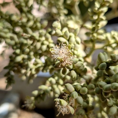 In deze kleine tuin groeien ook diverse palmen, ik vond het boeiend om de dadels te zien ontwikkelen vanuit de bloei. Dit is de zogenaamde Kerstmispalm (Adonidia merrillii)