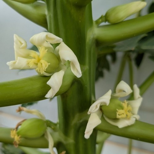 Op alle eilanden groeien op de meest onmogelijke plaatsen Papayabomen. Het is dan ook de gemakkelijkste vrucht om te kweken in de tropen. Ik vond 20 jaar geleden de smaak niet geweldig, maar wen er nu steeds meer aan. Op Santiago zag je ze spontaan, maar ook aangeplant. Bij plantages worden extra vruchtbare, lagere boompjes gebruikt, het zaad ervan verkopen we en wordt in Azië door kruisingen verkregen. Deze foto laat een uniek stadium zien: de bloei! Je ziet vrouwelijke bloemen,
