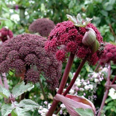 Een indrukwekkende schermbloemige die tot 1,5 meter hoog kan worden. Wordt soms verward met berenklauw, maar is kleiner, met rondere schermen – én vooral: hij is eetbaar! De jonge stelen zijn zoet en heerlijk om mee te koken met rabarber – ze halen het scherpe randje eraf. Van het blad kun je een kruidige thee trekken. Deze bijzondere variëteit steelt de show met rode stengels en bloemen, in mooi contrast met het groene blad.