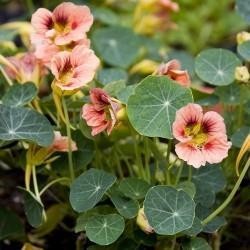 Door de extra compacte groei is dit ras perfect voor kleinere ruimtes – denk aan balkonbakken, potten of een zonnig hoekje op het terras. De frisgroene, ronde blaadjes zijn net als de bloemen eetbaar en een feestelijke toevoeging aan salades. De bloemen bloeien in zachte tinten van roze tot zalmroze, met charmante wijnrode vlekjes bij het keeltje, dat opvallend geel is. Een plaatje om te zien én heerlijk veelzijdig!