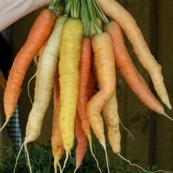 Gemengde wortelen op uw bord: een prachtig pastelmengsel van slanke, smakelijke wortels in zachte overgangen van wit, crème, geel en oranje. Let op: rood en zwart zijn niet inbegrepen en dienen apart besteld te worden. Een waar sieraad op het bord, dat zowel rauw als gekookt kleurrijk verrast! Ondanks de verschillende kleuren zijn de wortels gelijktijdig oogstbaar.