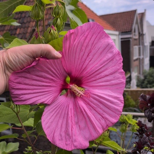Ik geniet zelf enorm van mijn dakterras (50 m²), gisteren gingen de eerste grootbloemige Hibiscusbloemen open, elk jaar weer wonderschoon!