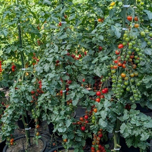We hebben voor 2026 trouwens heel goed nieuws, we introduceren een aantal hogere (dus lang oogstbare) rassen, die zeer goed ziektebestendig zijn voor de buitenteelt. Een van onze kwekers is druk bezig om speciaal voor de hobbyisten deze rassen te ontwikkelen. Ik ben op hun proeftuin geweest (zie foto) en was verbaasd over de prachtige, gezonde planten met heerlijke vruchten!