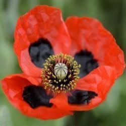 Deze opvallende klaproos heeft helder rode bloemblaadjes met in het hart vier karakteristieke zwarte vlekken, wat haar een bijna sierlijke, vlinderachtige uitstraling geeft. De bloemen staan licht en luchtig op slanke stelen en brengen een speels, natuurlijk effect in de tuin.