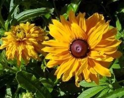 Bij een langere bloeiperiode opent het bloemhart zich geleidelijk, waardoor het donkerbruine centrum zichtbaar wordt en een mooi contrast vormt met de gele bloemblaadjes. Een sterke en dankbare bloeier die langdurig kleur en sfeer brengt in de tuin.